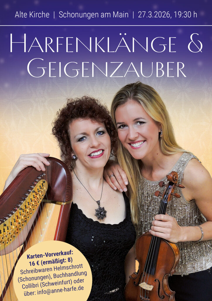 Konzert in der Alten Kirche in Schonungen am 27.März 2026 um 19:30 h Daniela Reimertz (Violine) und Anne Kox-Schindelin (Harfe) führen mit ihrem Programm „Harfenklänge und Geigenzauber“ ihre Zuhörer in eine Welt voller romantischer Melodien, die die beiden Musikerinnen virtuos und ausdrucksstark darbieten. Bekanntes aus Klassik, Musical und Film gibt sich dabei ein Stelldichein und […]