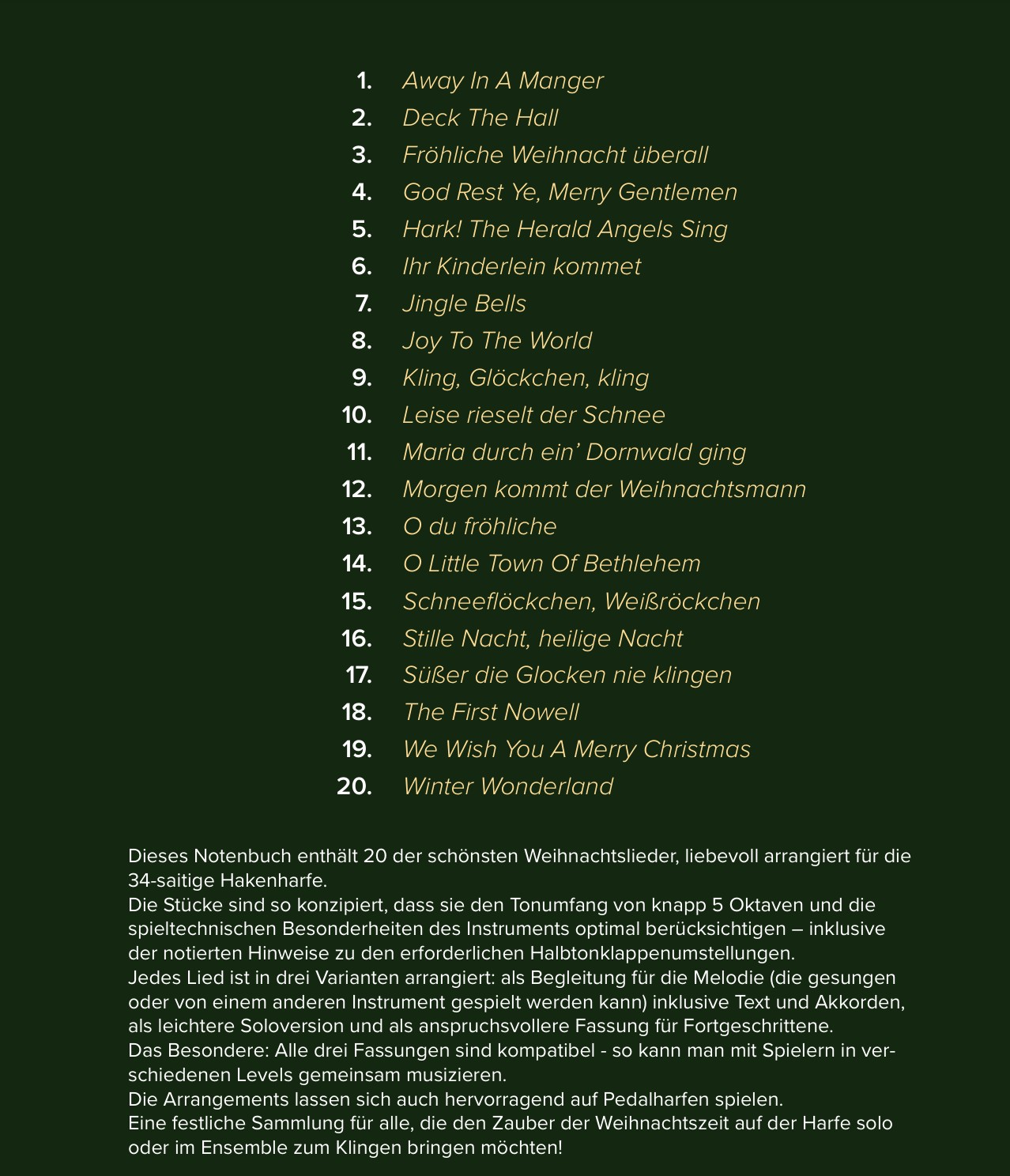 Diese 20 beliebten Advents- und Weihnachtslieder sind so arrangiert, dass alle Titel auf der 34-saitigen Hakenharfe spielbar sind und mit vielen anderen Instrumenten wie z.B. Flöte/Violine/Klavier und Gesang kombinierbar sind.